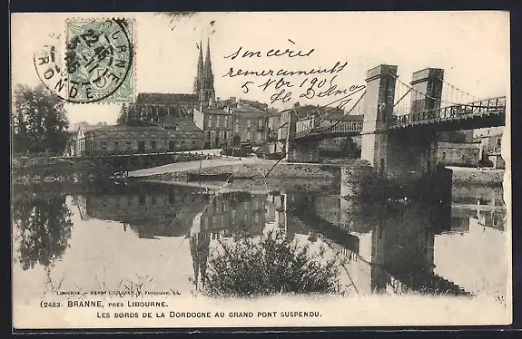 AK Branne, Les bords de la Dordogne au grand pont suspendu