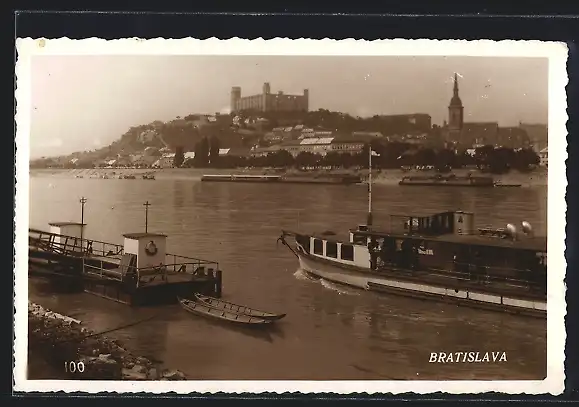 AK Bratislava, Dampfer fährt Richtung Anlegestelle, Feste im Hintergrund