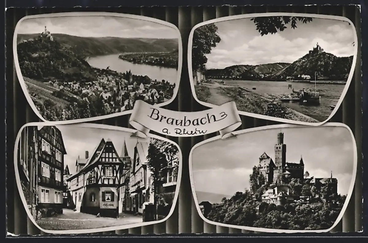 AK Braubach /Rh., Burg, Strassenpartie, Totalansicht mit Rhein