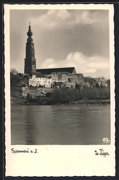 AK Braunau a. I., Flusspartie mit Stadtpfarrkirche