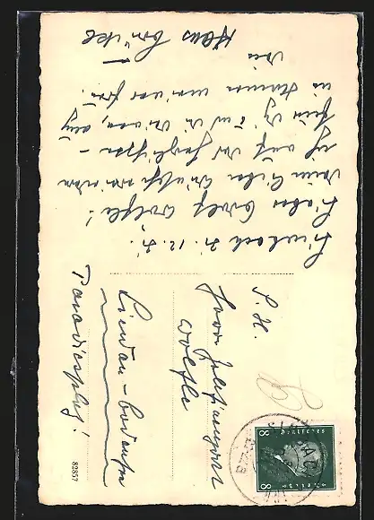 Personenbezogene Daten auf der Rückseite der Karte wurden durch blauen Textmarker unkenntlich gemacht. Die blauen Stellen sind auf die Vorderseite durchgeweicht und wirken sich negativ auf das Postkartenfoto aus