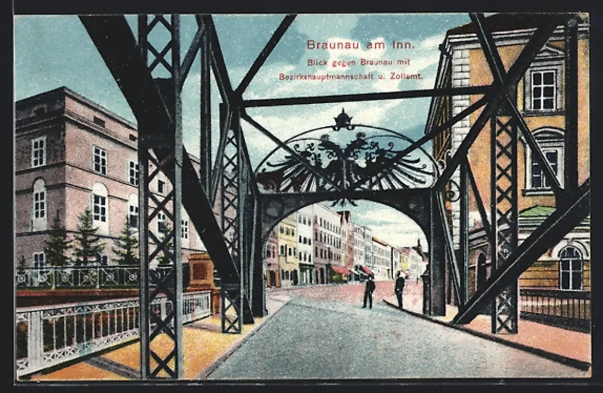 AK Braunau a. Inn, Blick gegen Braunau mit Bezirkshauptmannschaft u. Zollamt