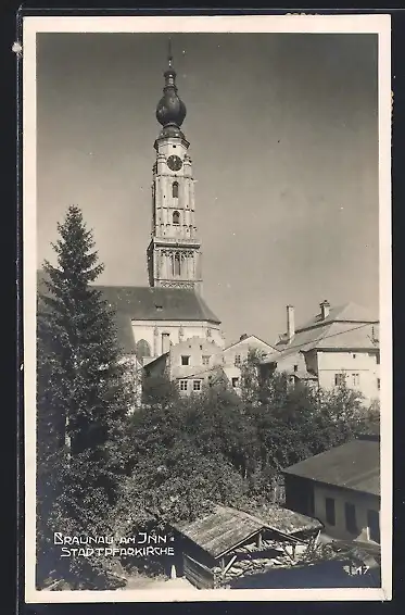 AK Braunau a. Inn, Blick zum Turm der Stadtpfarrkirche