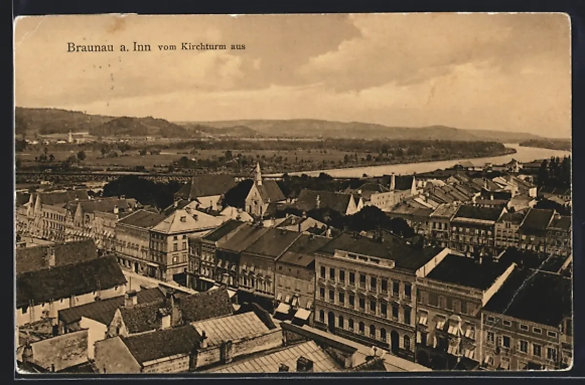 AK Braunau am Inn, Blick über die Dächer der Stadt vom Kirchturm aus