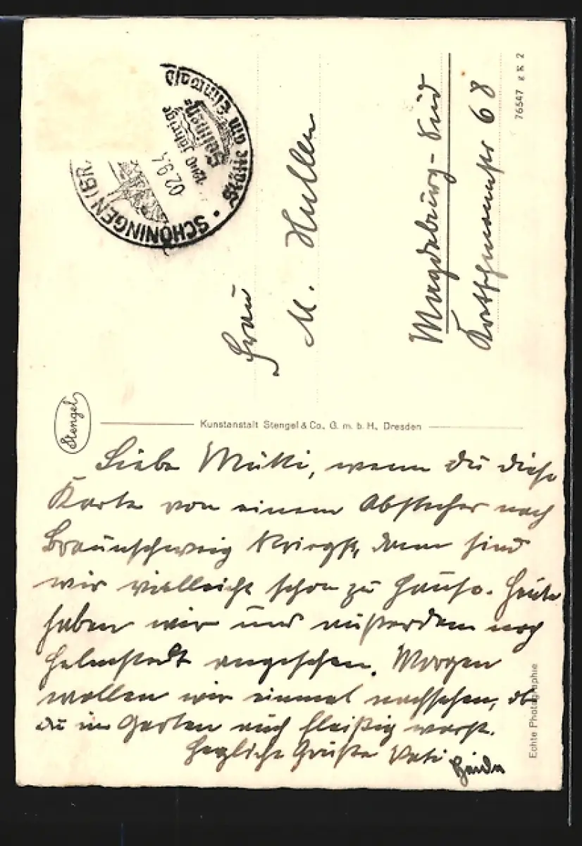 Personenbezogene Daten auf der Rückseite der Karte wurden durch blauen Textmarker unkenntlich gemacht. Die blauen Stellen sind auf die Vorderseite durchgeweicht und wirken sich negativ auf das Postkartenfoto aus