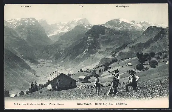 AK Braunwald, Blick auf die Tödikette, mit Landarbeitern, Ortspartie