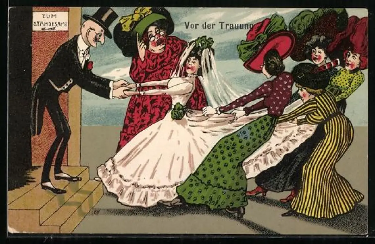 AK Braut vor dem Standesamt im Brautkleid wird von Frauen weggezogen