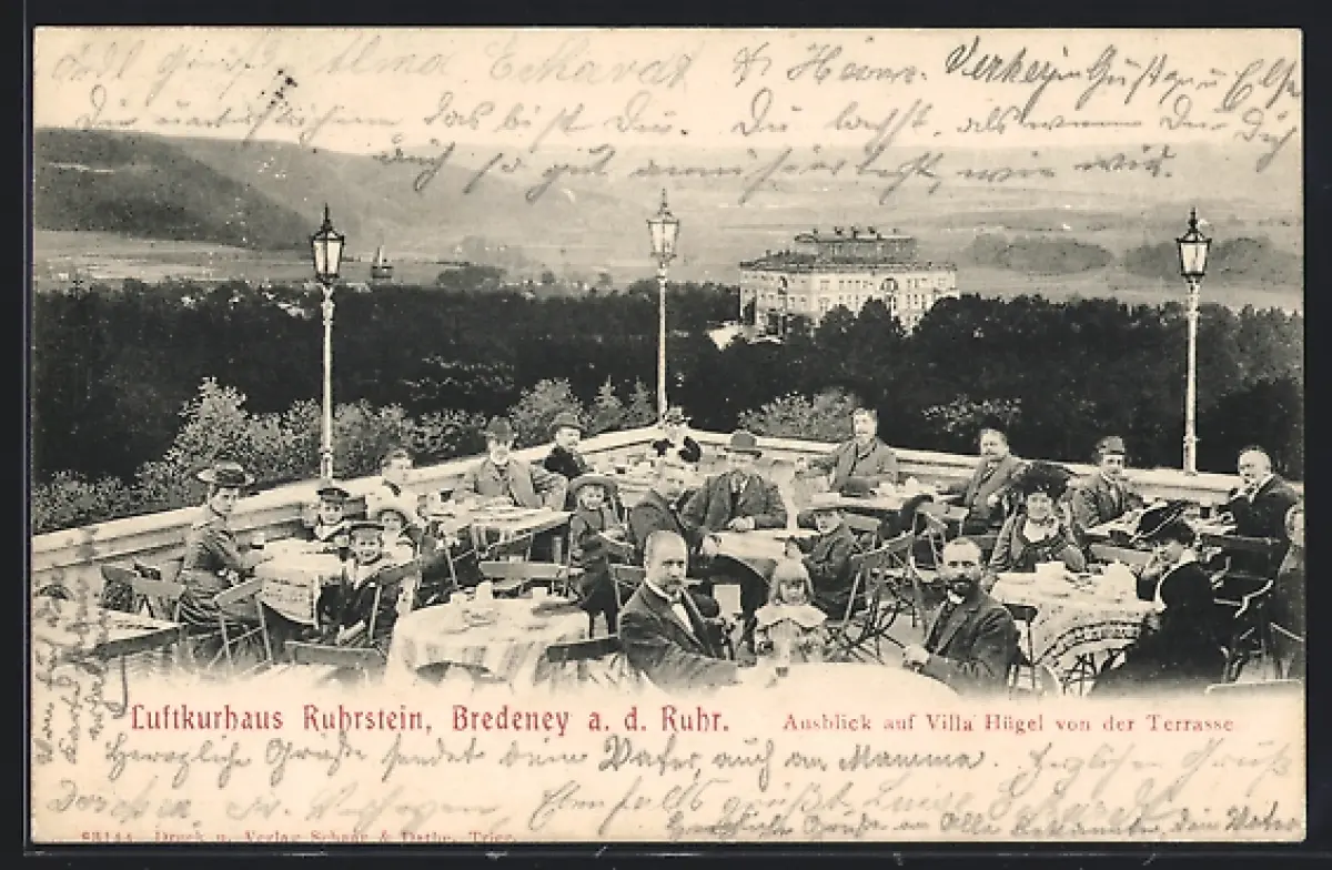 AK Bredeney a. d. Ruhr, Kurhaus Ruhrstein, Ausblick auf Villa Hügel von der Terrasse