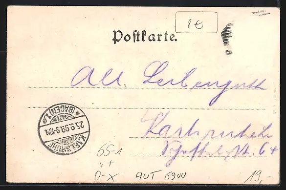 alte Ansichtskarte, gelaufen 1899, Briefmarke entfernt, rückseitig Oberflächenschaden, Bugspur li. oben, guter Zustand