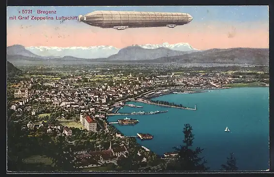 AK Bregenz, Graf Zeppelins Luftschiff über der Stadt, Hafen