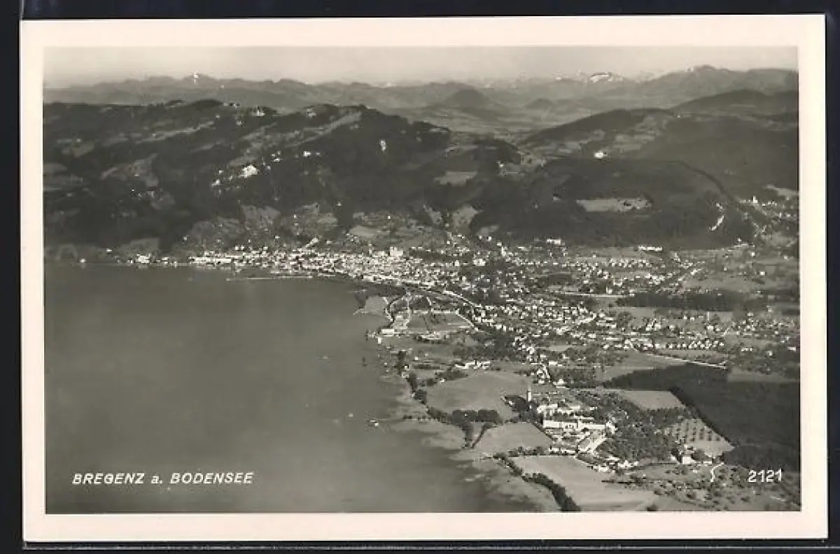 AK Bregenz a. Bodensee, Luftaufnahme mit Stadt, Ufer und Gebirgspanorama