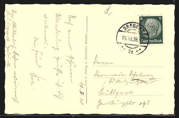 gelaufen 1938, Eckknick li. unten, guter Zustand