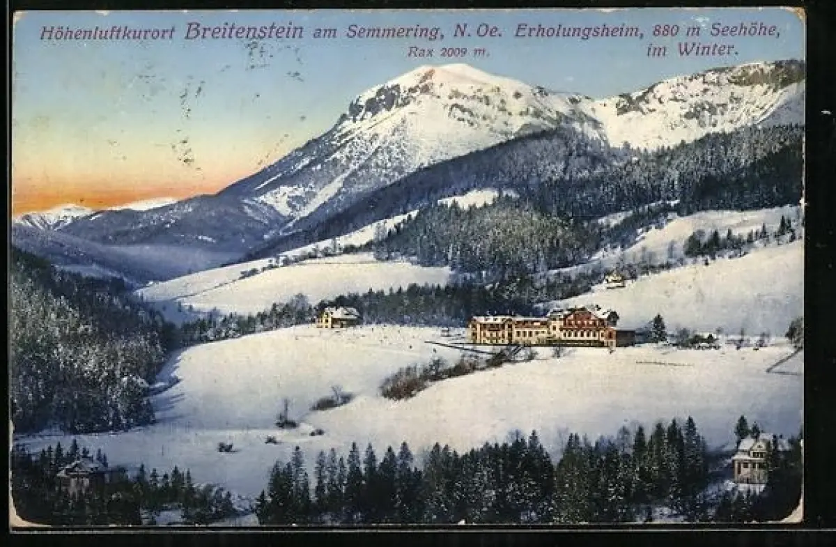 AK Breitenstein am Semmering, Blick auf das Erholungsheim mit Rax im Winter
