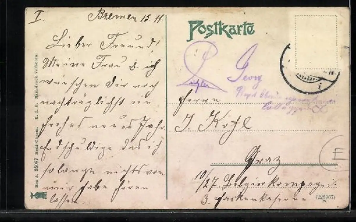 Personenbezogene Daten auf der Rückseite der Karte wurden durch blauen Textmarker unkenntlich gemacht. Die blauen Stellen sind auf die Vorderseite durchgeweicht und wirken sich negativ auf das Postkartenfoto aus