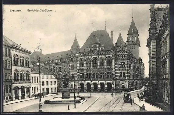 AK Bremen, Gerichts-Gebäude mit Vorplatz, Bahnschienen und Pferdekutsche