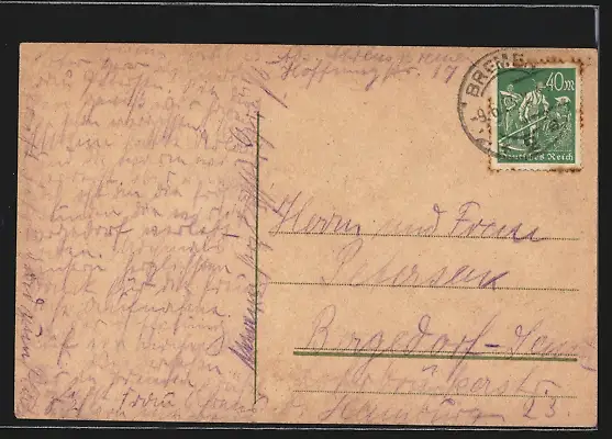 Personenbezogene Daten auf der Rückseite der Karte wurden durch blauen Textmarker unkenntlich gemacht. Die blauen Stellen sind auf die Vorderseite durchgeweicht und wirken sich negativ auf das Postkartenfoto aus