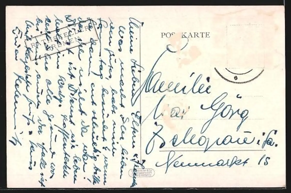 alte Ansichtskarte, gelaufen, Briefmarke entfernt, rückseitig Oberflächenschaden, guter Zustand