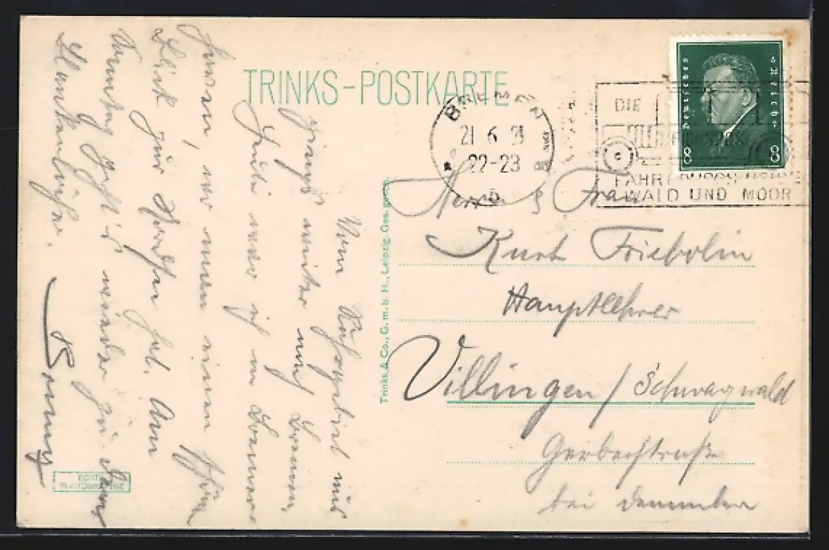 Personenbezogene Daten auf der Rückseite der Karte wurden durch blauen Textmarker unkenntlich gemacht. Die blauen Stellen sind auf die Vorderseite durchgeweicht und wirken sich negativ auf das Postkartenfoto aus