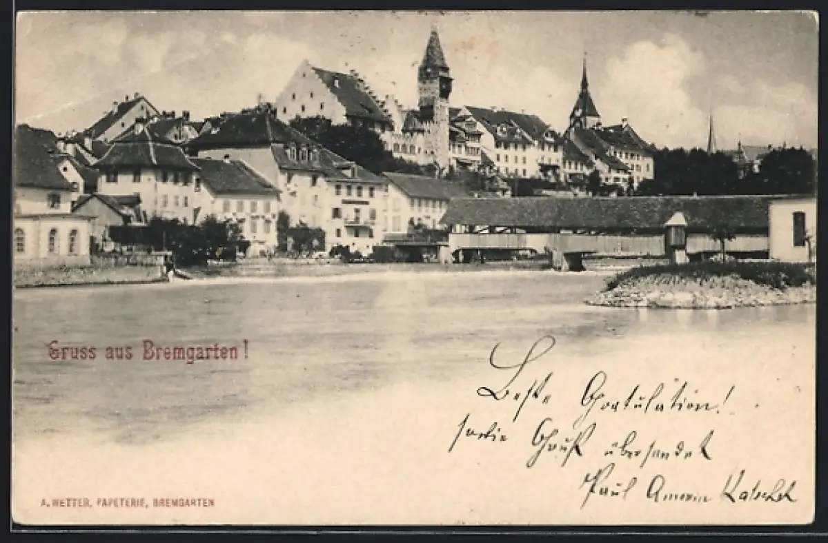 AK Bremgarten /AG, Ortspanorama vom Wasser aus, mit überdachter Brücke