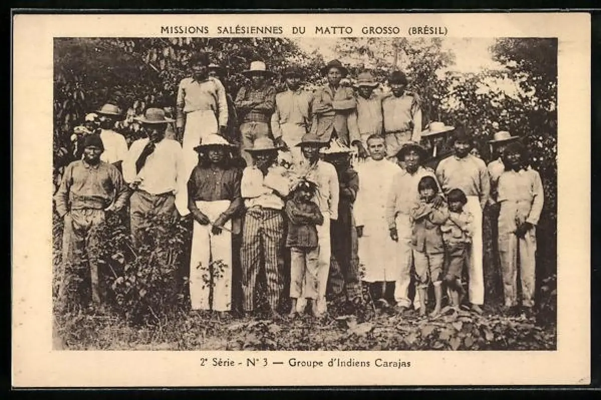 AK Brésil, Missions Salésiennes du Matto grosso, Groupe d`Indiens Carajas, Missionare