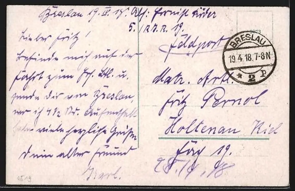 alte Ansichtskarte, gelaufen 1918 als Feldpost, Eckknick links unten, guter Zustand
