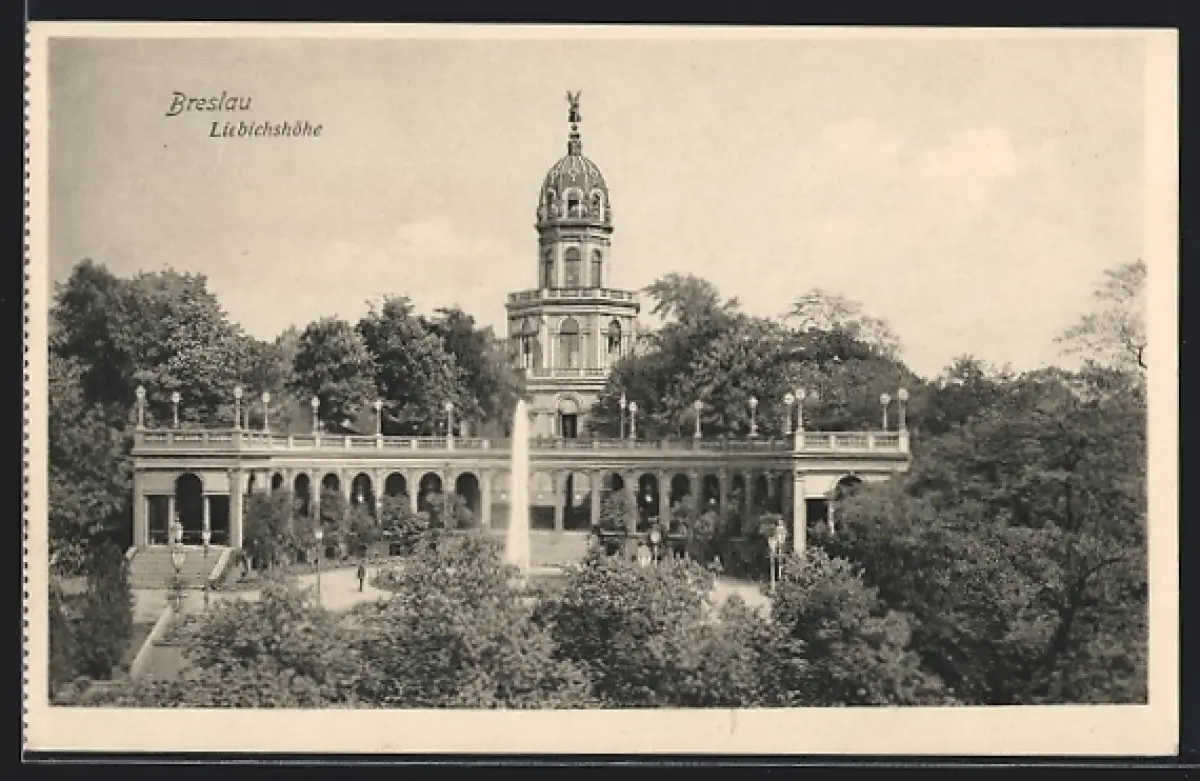 AK Breslau, Liebichshöhe, Gebäude mit Springbrunnen aus der Vogelschau