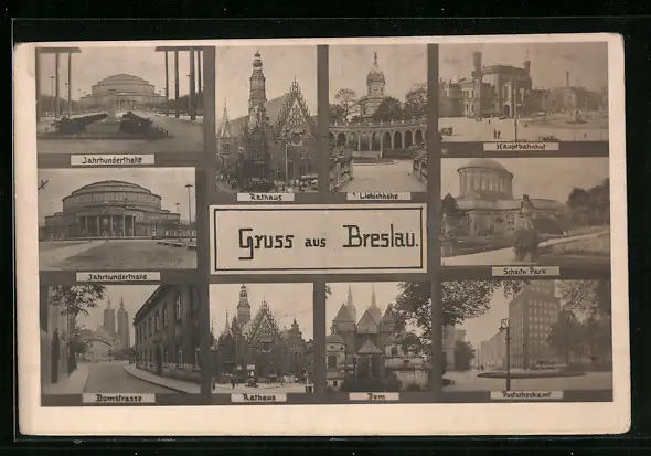 AK Breslau, Postscheckamt, Jahrhunderthalle, Rathaus, Liebichhöhe, Hauptbahnhof, Domstrasse