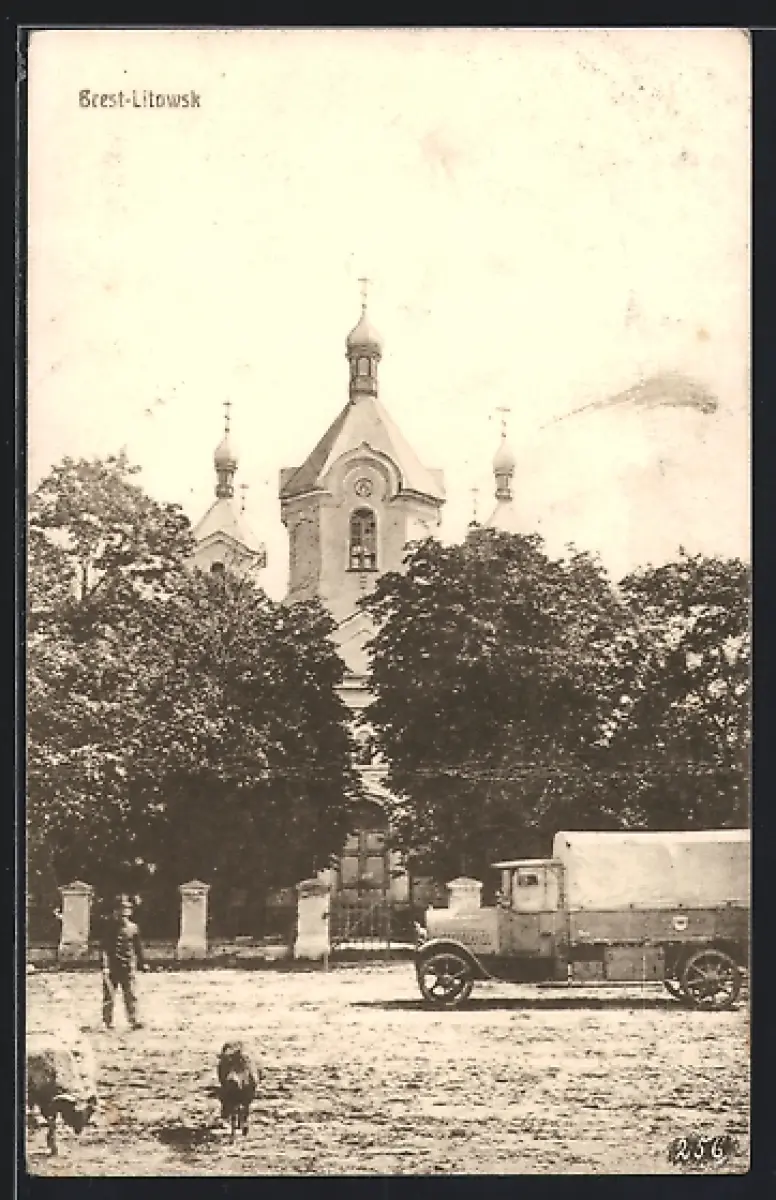 AK Brest-Litowsk, Strassenpartie mit Blick zur Kirche