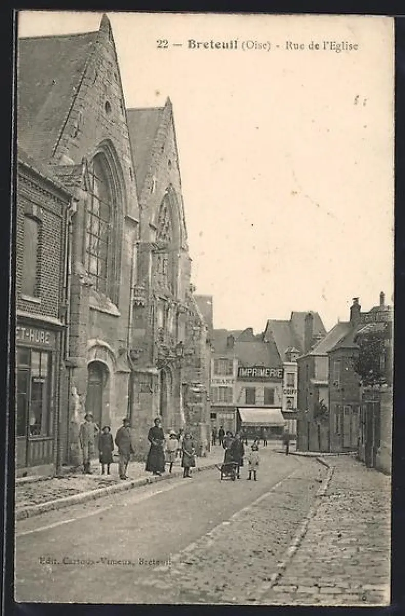 AK Breteuil /Oise, Rue de l`Église animée avec passants et édifices historiques
