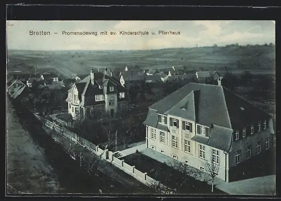 AK Bretten, Promenadeweg mit ev. Kinderschule und Pfarrhaus aus der Vogelperspektive