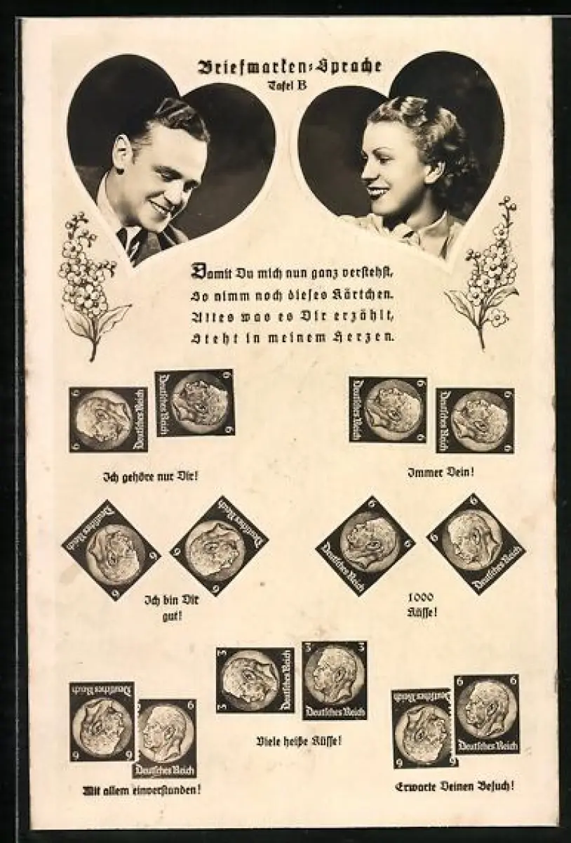 AK Briefmarken-Sprache, Ich bin Dir gut!, Immer Dein!, Mit allem einverstanden!, Dame und Herr im Herz