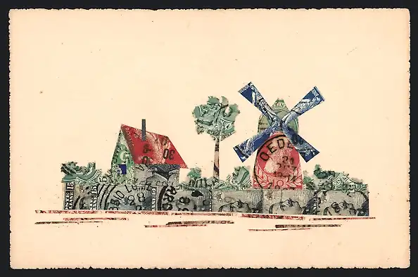 AK Briefmarkencollage in Form einer Dorfszene mit Windmühle