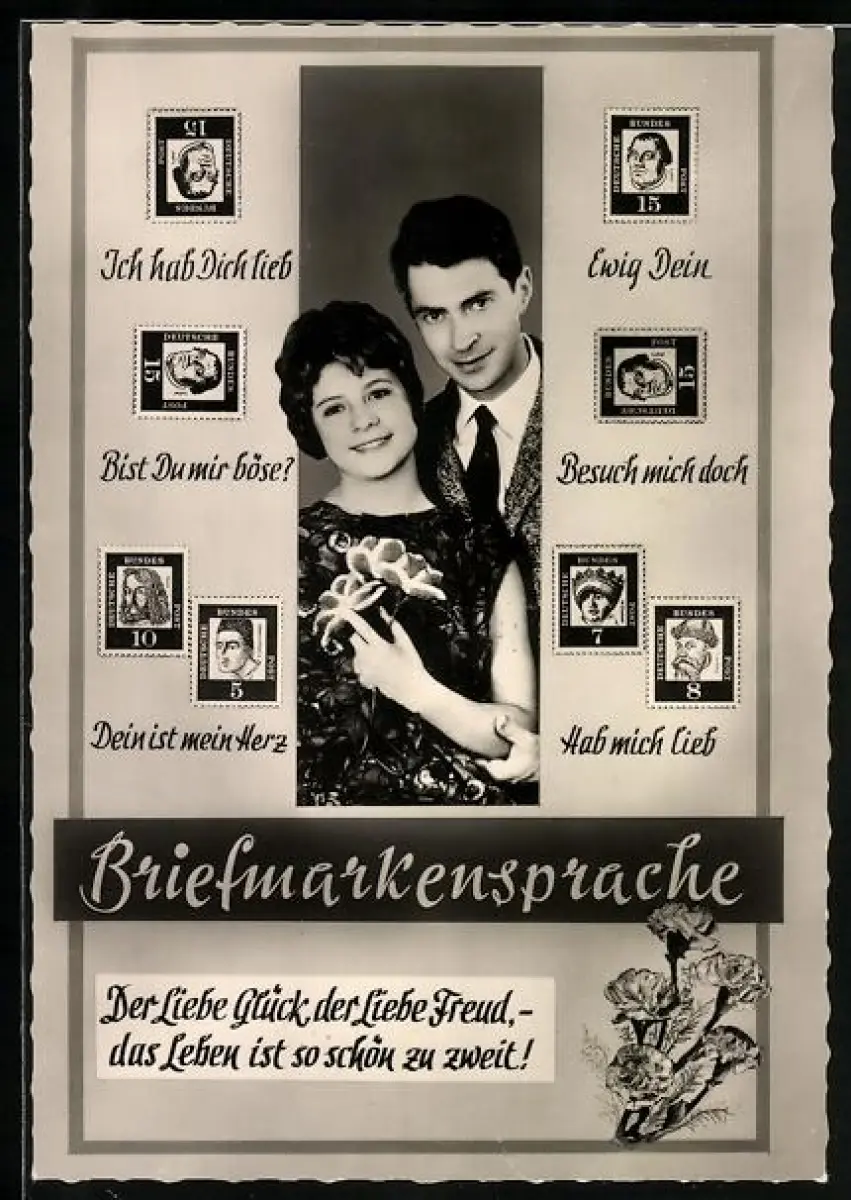 AK Briefmarkensprache, Der Liebe Glück, der Liebe Freud..., junge Paar