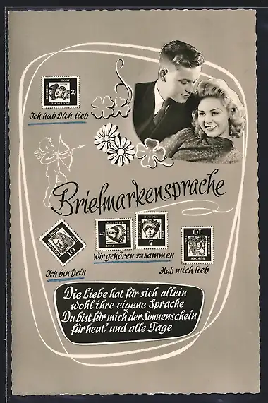 AK Briefmarkensprache: Hab mich lieb & Ich bin Dein, Liebespaar