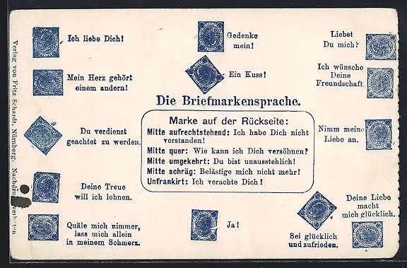 AK Briefmarkensprache, Ich liebe Dich!, Ein Kuss!, Ja!