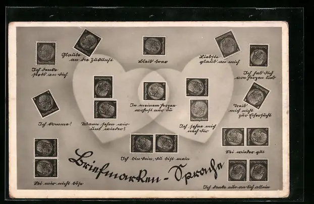 AK Briefmarkensprache, Liebste glaub an mich und Ich denke stets an Dich, zwer Herzen