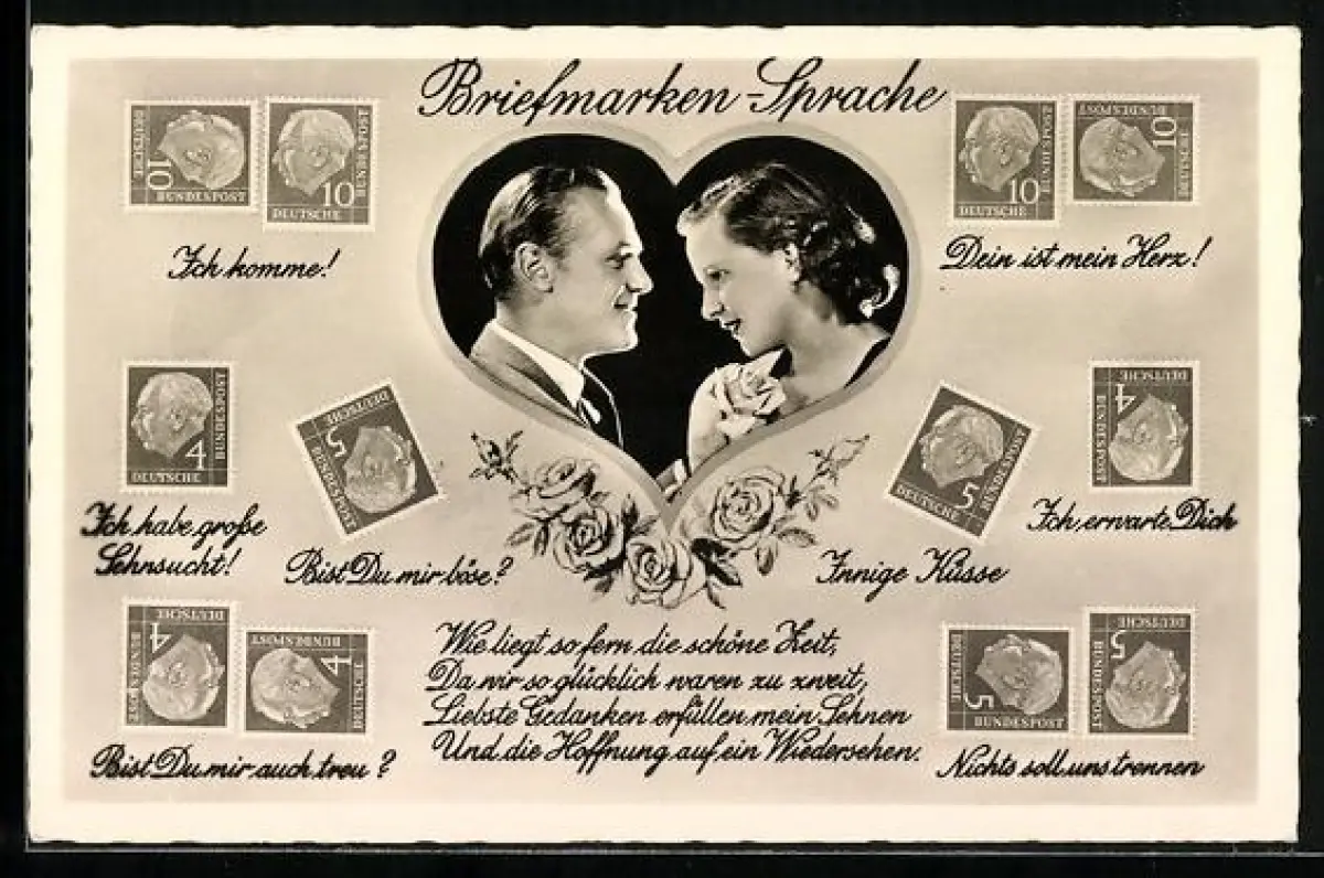 AK Briefmarkensprache, Paar in einem Herz, diverse Briefmarken