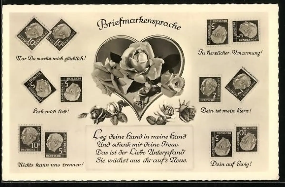 AK Briefmarkensprache, Rosenstrauss, Gedicht Leg deine Hand in meine Hand