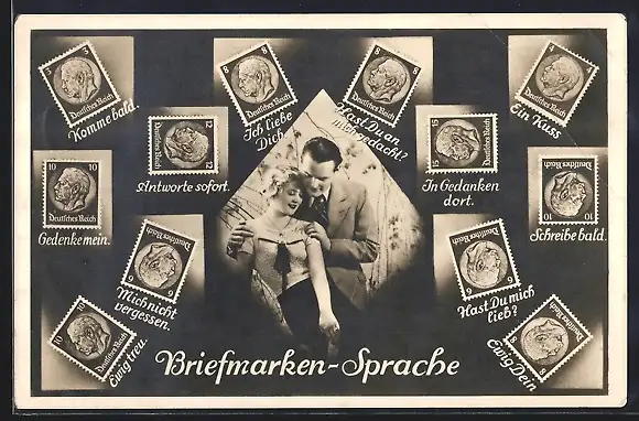 AK Briefmarkensprache für Verliebte, Mann fasst der Frau an die Schulter