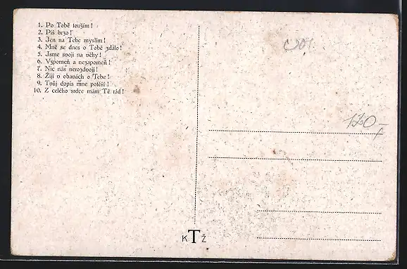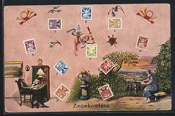 AK Briefmarkensprache für Verliebte, junger Herr sitzt am Schreibtisch