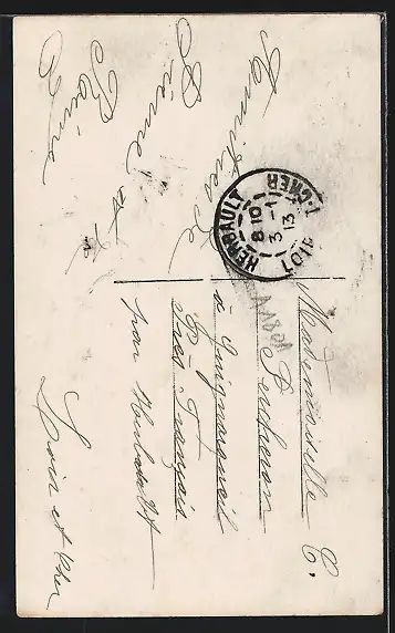 Personenbezogene Daten auf der Rückseite der Karte wurden durch blauen Textmarker unkenntlich gemacht. Die blauen Stellen sind auf die Vorderseite durchgeweicht und wirken sich negativ auf das Postkartenfoto aus