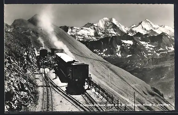AK Brienz, Brienzer-Rothorn mit Bergbahn, Eiger, Mönch und Jungfrau