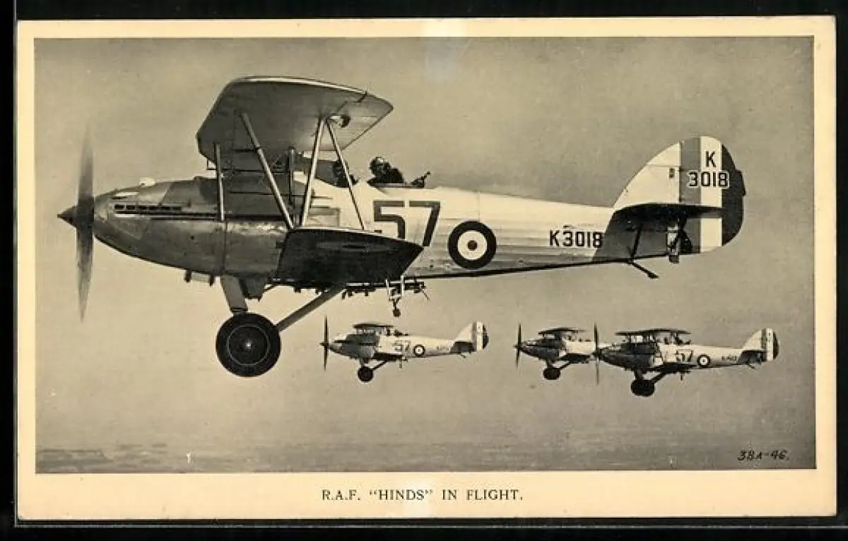 AK Britischer Doppeldecker-Bomber Hawker Hind, vier Maschinen im Flug, RAF