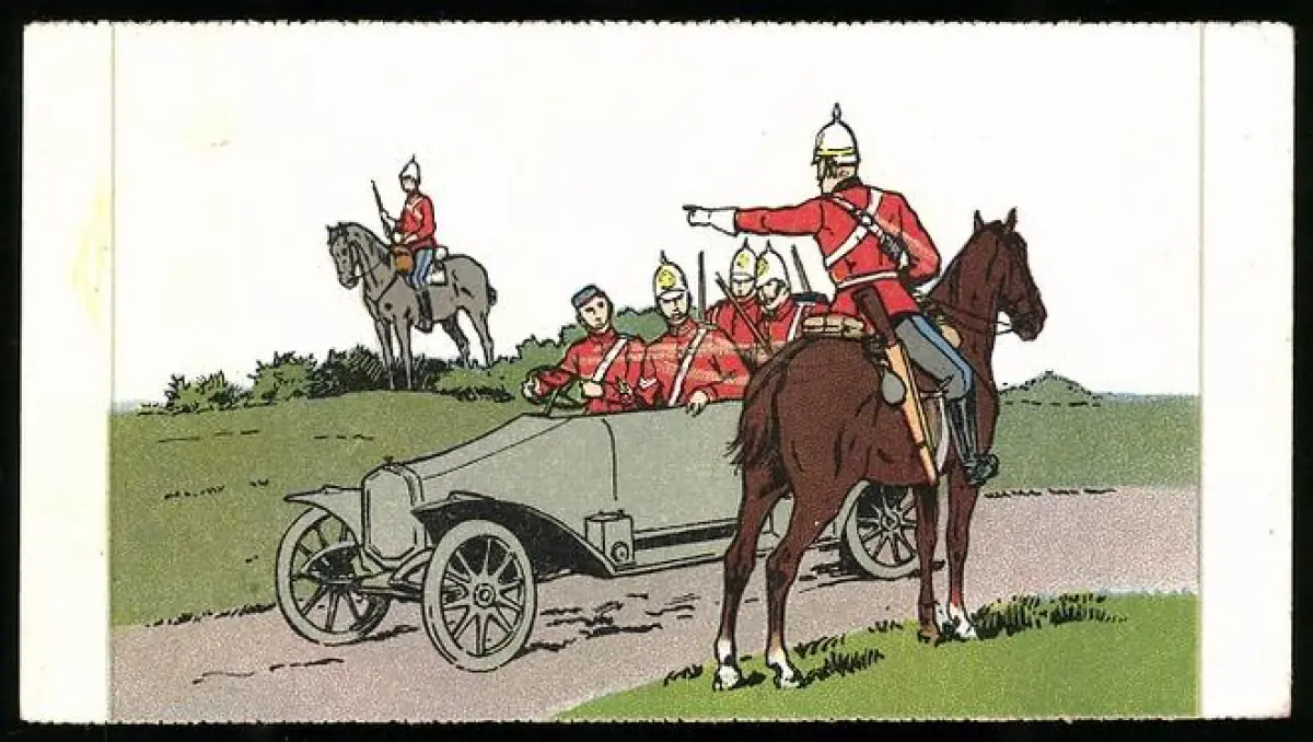 AK Britischer Soldat zu Pferde weist seinen Kameraden im Automobil den Weg