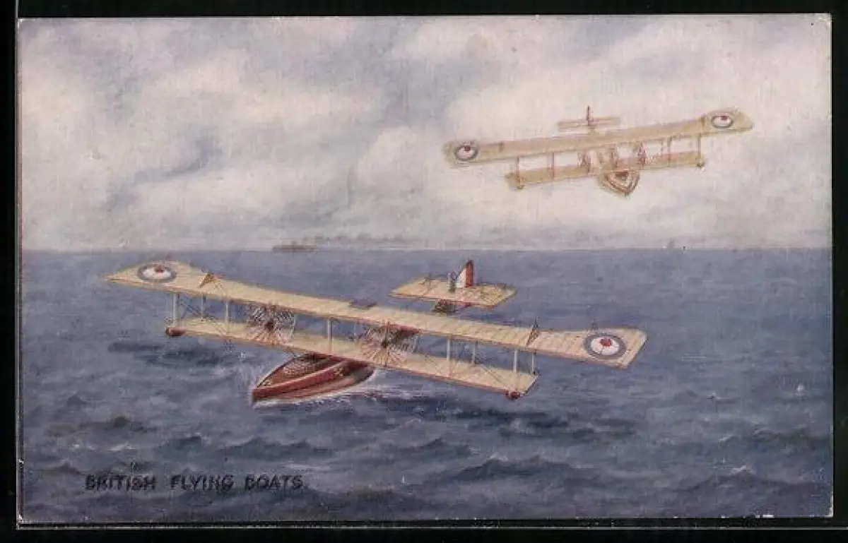 AK British Flying Boats, Wasserflugzeuge landen auf dem Meer