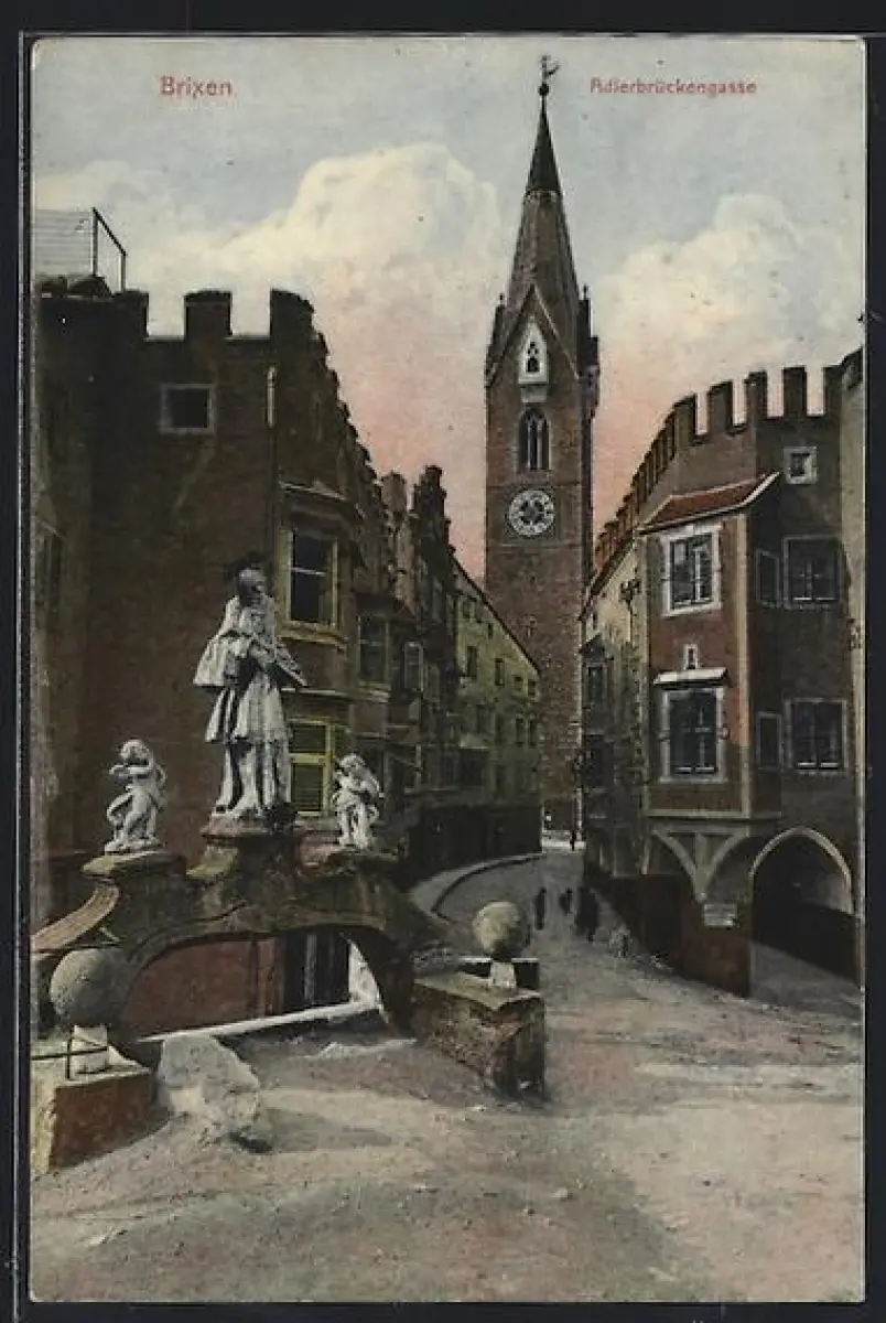 AK Brixen, Adlerbrückengasse mit Kirchturm, Skulpturen u. Arkadengang