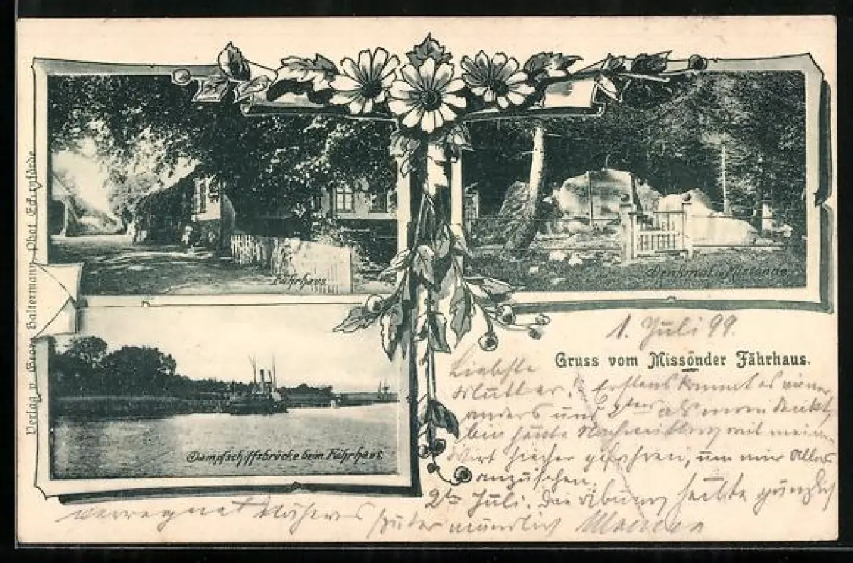 AK Brodersby / Schleswig, Gasthof Missonder Fährhaus, Dampfschiffbrücke und Denkmal in Missonde