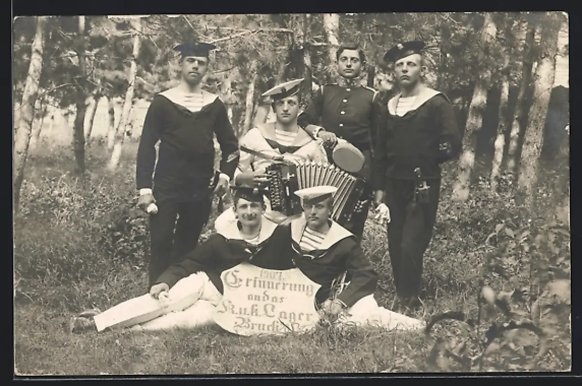AK Bruck a. L., Gruppenaufnahme von Soldaten und Matrosen des k.u.k. Militärlagers Bruck a. d. L.