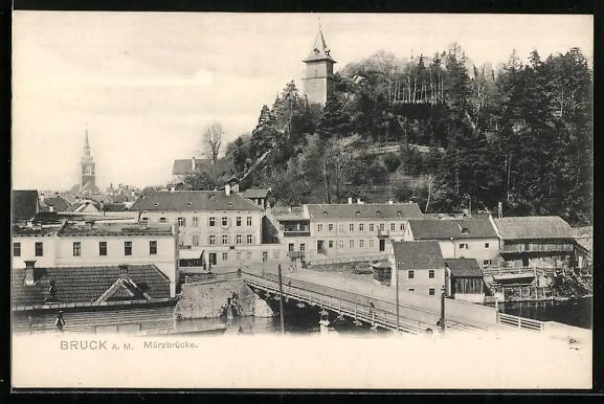AK Bruck a. M., Märzbrücke mit Ortspanorama, Türme