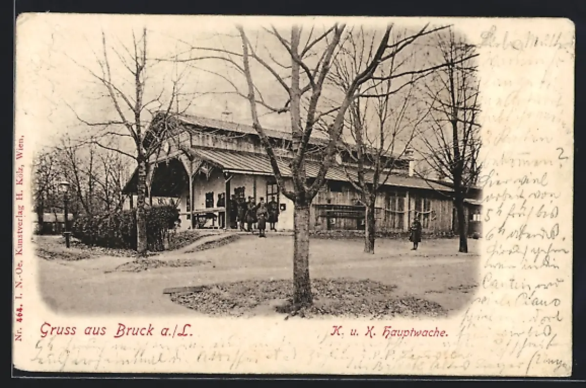 AK Bruck a. d. Leitha, K. u. K. Hauptwache mit Soldaten